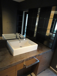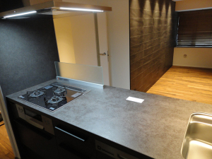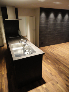 高級石材を使った黒仕様のオープンキッチン、洗面台など。