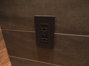 “ 黒タイル壁 ”にあるコンセントの色も、こだわりのブラック。